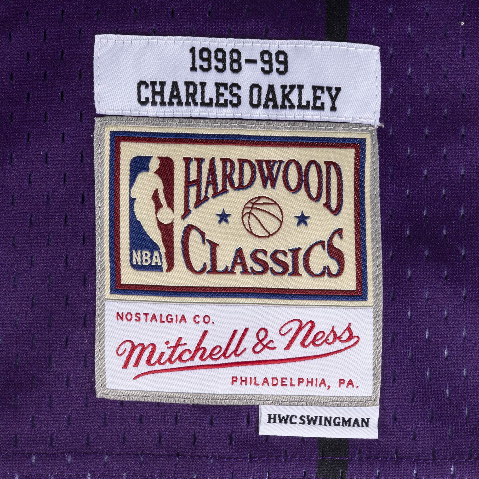 - Mitchell & Ness HWC Swingman woven jocktag and woven label player name/year ID at lower left front.