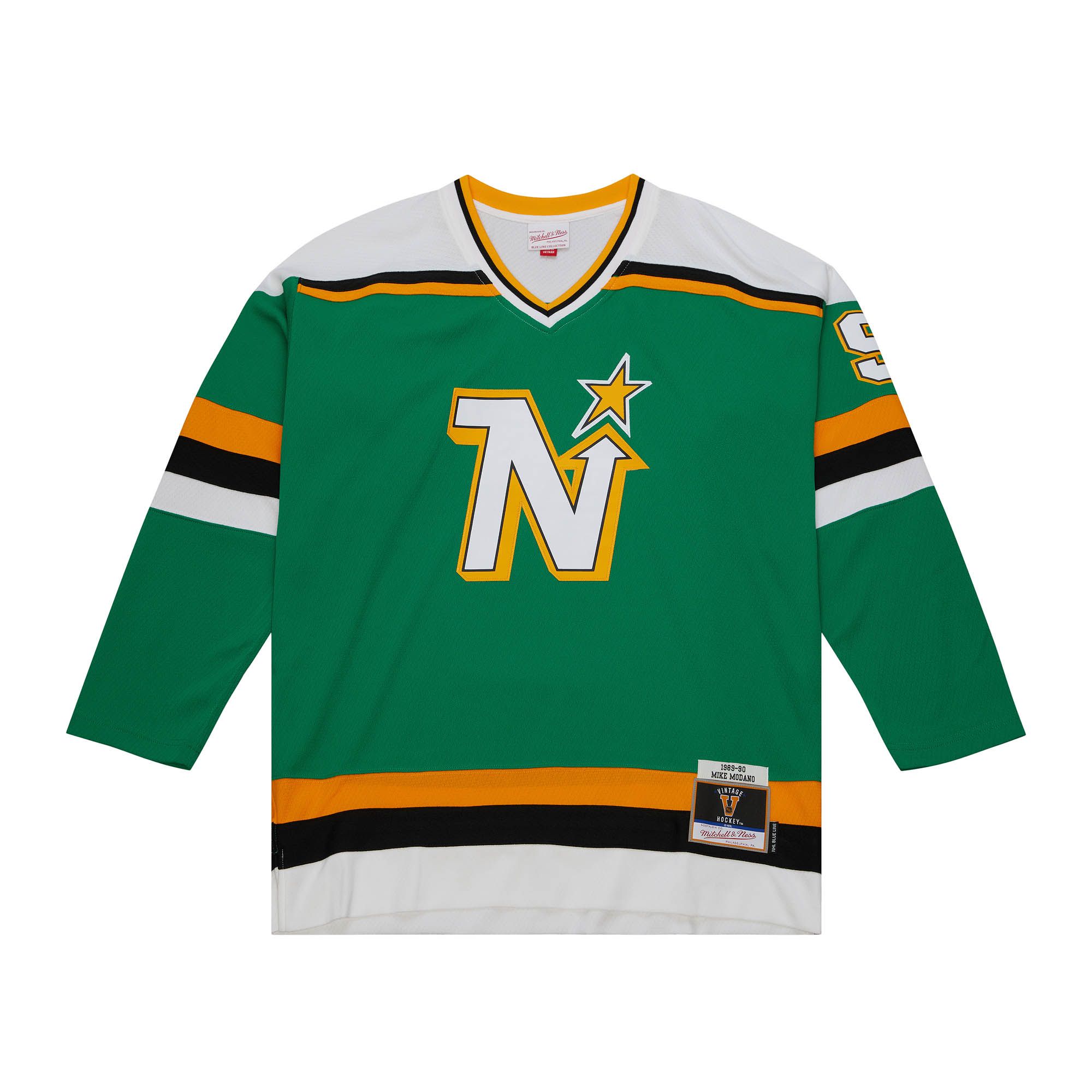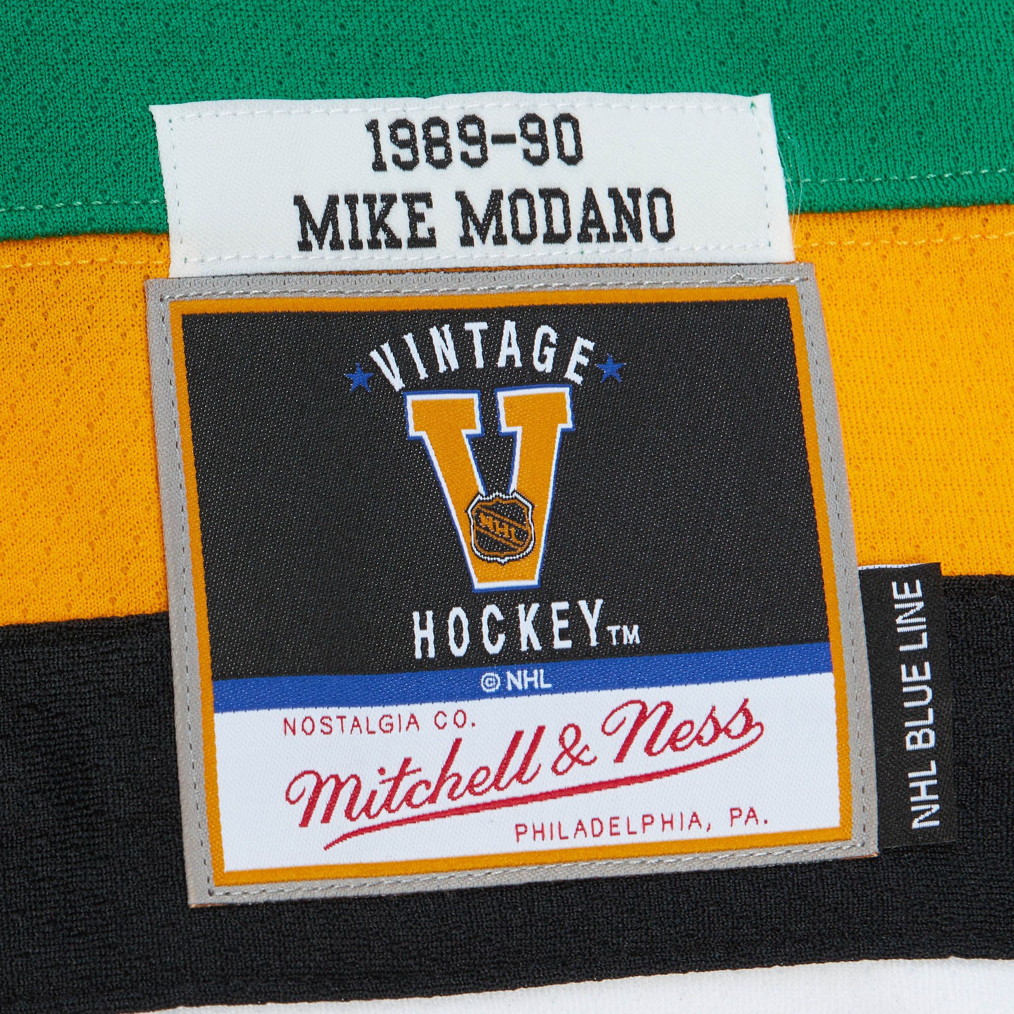 Add to your hockey jersey collection with Mike Modano Minnesota North Stars Mitchell & Ness White 1989 Blue Line Jersey. Featuring authentic team colors and vintage design, this throwback uniform will bring you back in time representing your favorite all-time NHL player.